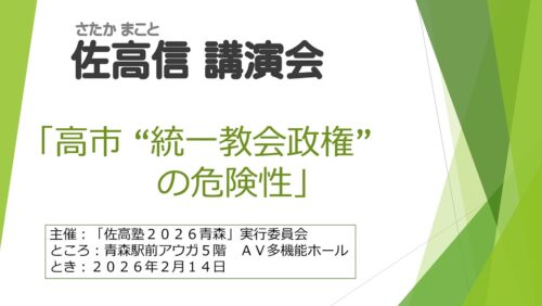 2026年佐高塾「高市”統一教会政権”の危険性」講演会(2月14日午後3時アウガ)